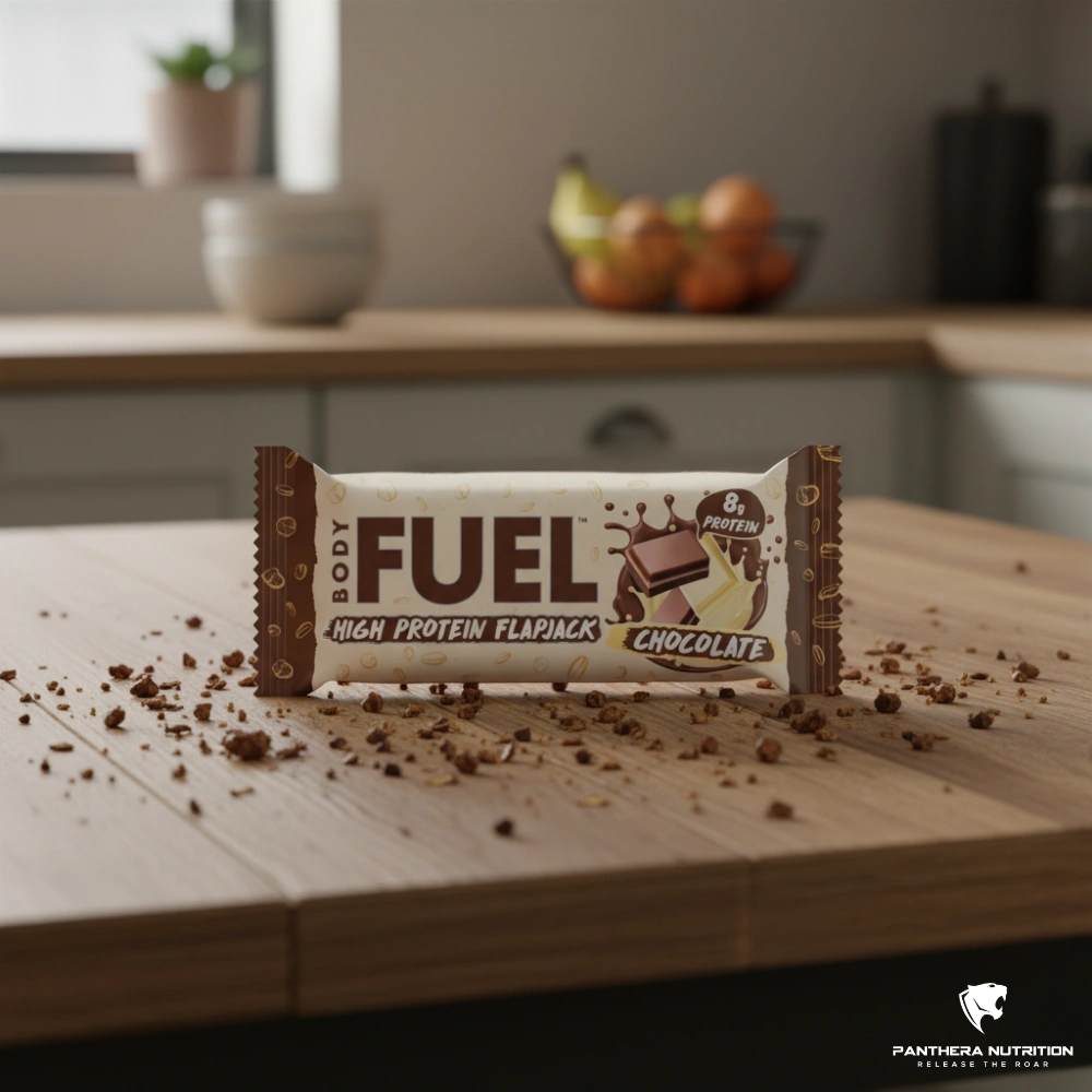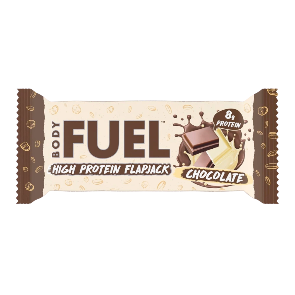 BodyFuel Flapjack je priročna in nasitna ovsena ploščica z dodanimi beljakovinami, ki združuje nežno sladek okus čokolade z mehko in prijetno teksturo.